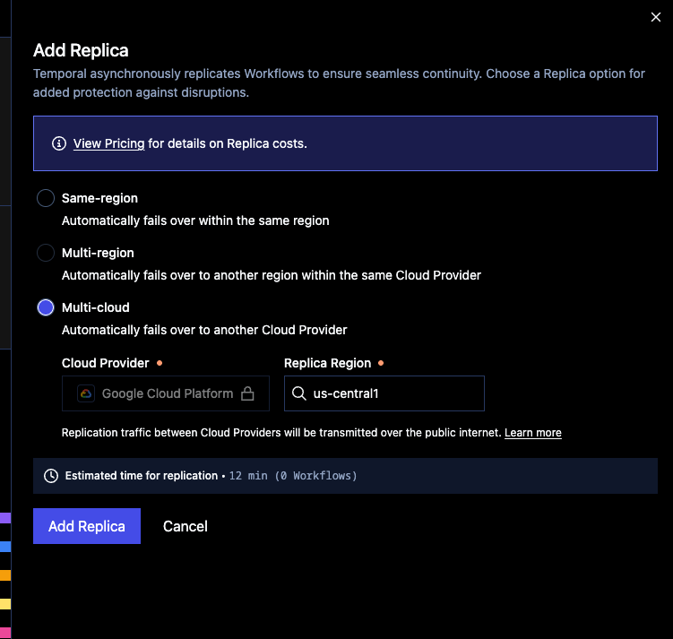 - Wait for the replica to become active. The Cloud UI will display a time estimate, and namespace admins will receive an email when the replica is active.
